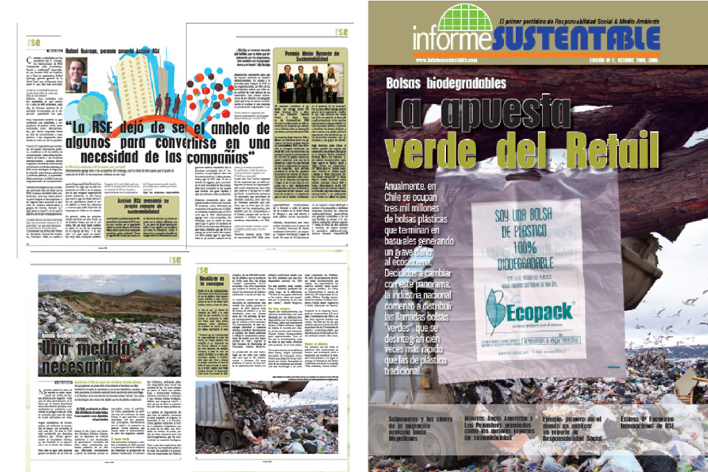 Diseño editorial para revista sobre medioambiente y responsabilidad social empresarial.